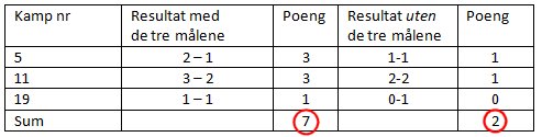 Forskjellen i poeng som en konsekvens av de tre målene er altså fem, og ikke syv poeng.